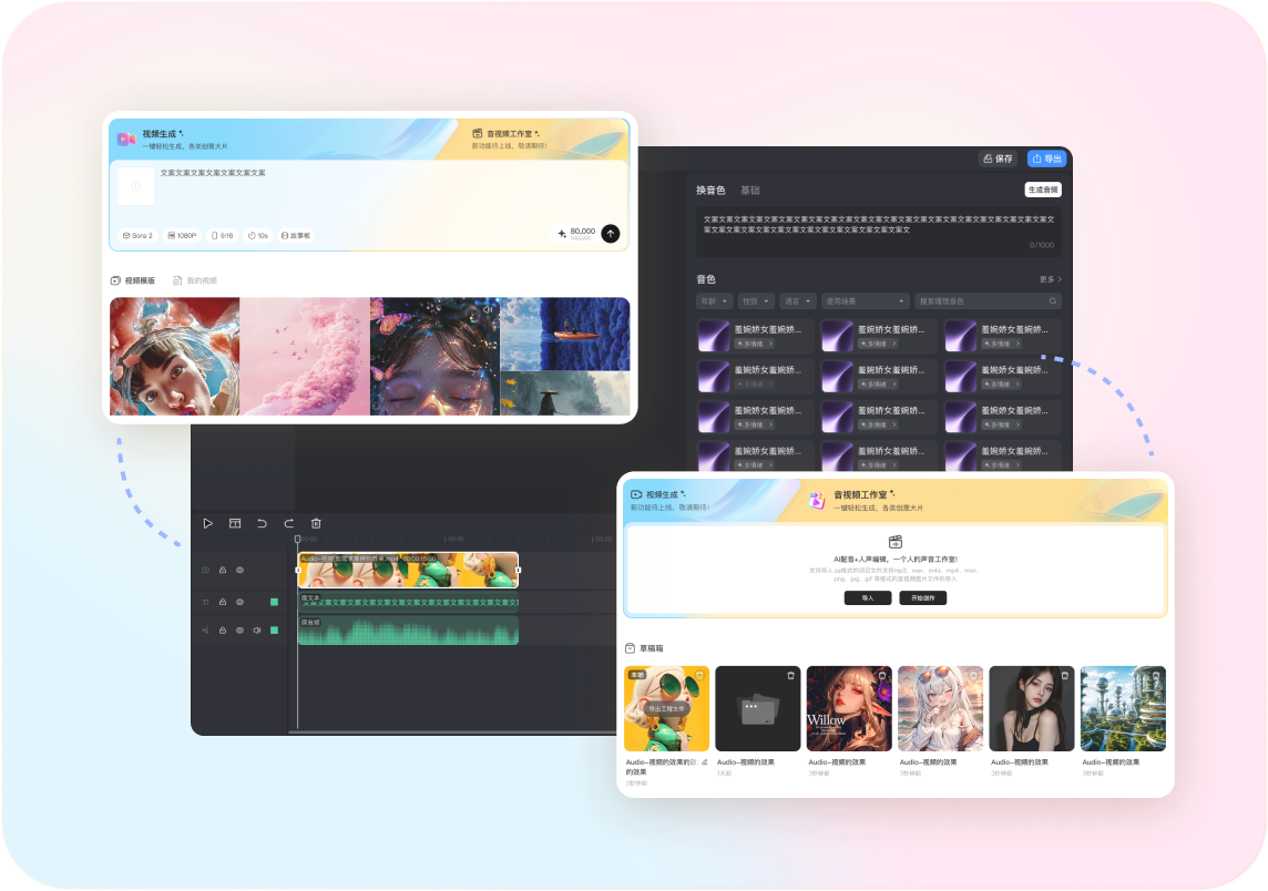 AI音视频创作平台,聚合强大的AI视频生成工具与音视频编辑工具。既是娱乐性十足的创作平台,又是实用性拉满的生产力工具,请在这里挥洒灵感AI音视频创作平台,聚合强大的AI视频生成工具与音视频编辑工具。既是娱乐性十足的创作平台,又是实用性拉满的生产力工具,请在这里挥洒灵感吧